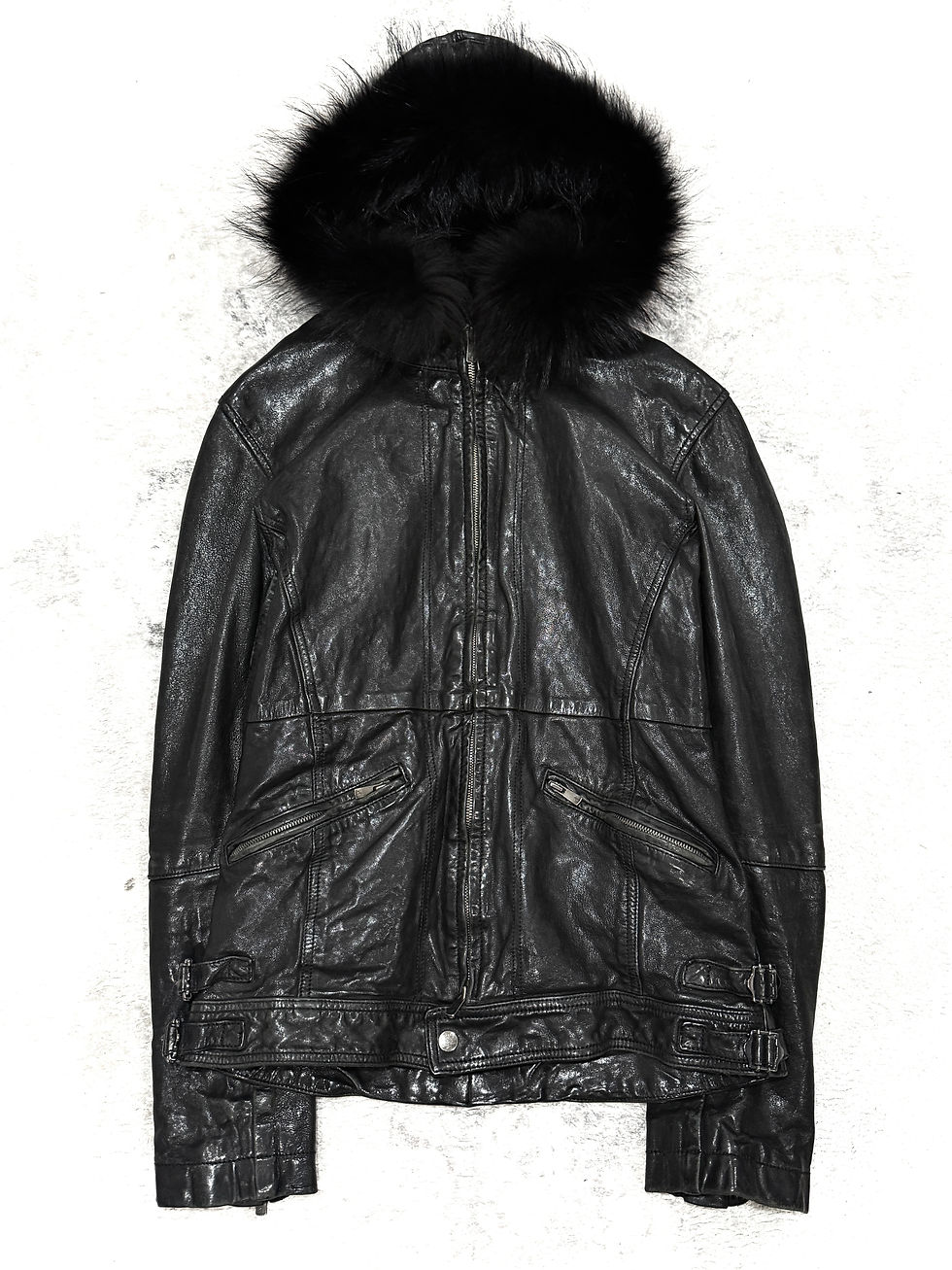 Modem Lovers was founded by the designer Shinya Kiyokawa in the early 2000's, whose work blends classic and contemporary influences in fashion, often reflecting Japanese youth culture. This Modem Lovers jacket channels a style reminiscent to those of Tornado Mart. Made from a suede-like fabric, it includes three zippered pockets and bondage straps around the waist and collar for versatile styling. The shearling interior fur lining extends from all hems and runs along the arms, creating a distinctive, Nordic-inspired trim.